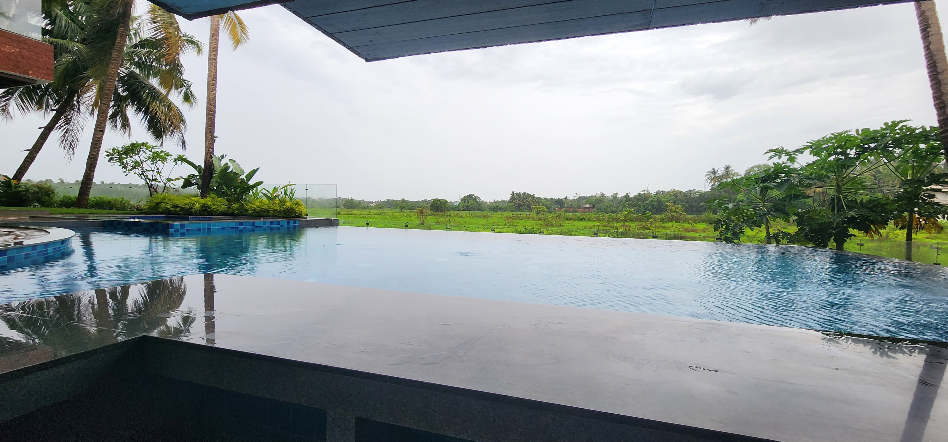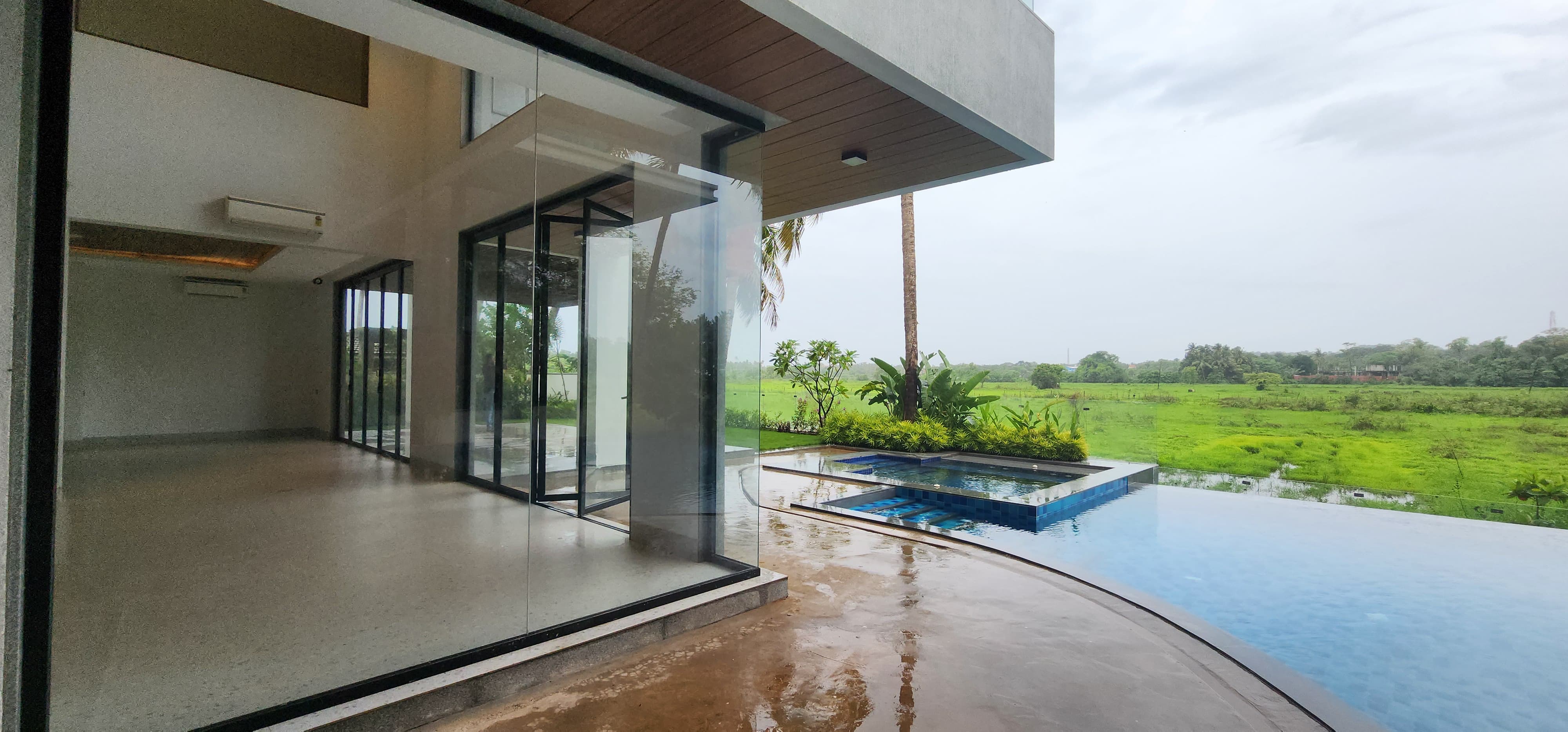 The villa has 5 bedrooms, 5 bathrooms, and a staff room with a separate entrance. There is a large heated infinity pool with a jacuzzi and bar (1,200 sq. ft.) and a pool deck (430 sq. ft.). The Villa also has a double-height living room and a fully equipped modular kitchen. The villa also has 100% power backup, air conditioning in all rooms, a security surveillance system, and covered parking for two cars (with space for three more).
